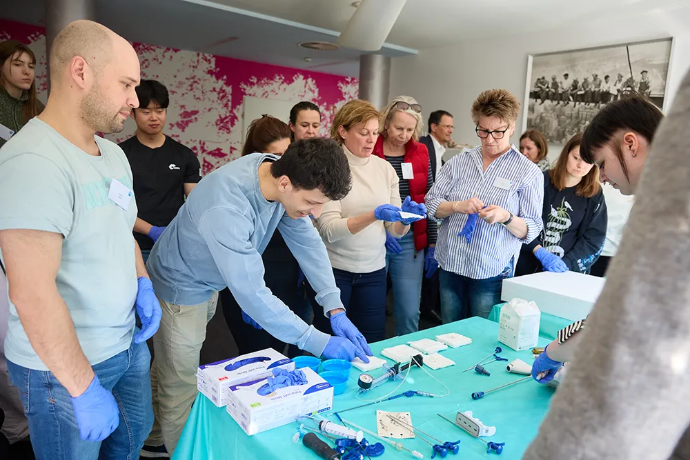 Der Nachmittag stand dann wie immer im Zeichen der Workshops. Die Physiotherapeuten der ATOS Orthoparc Klinik führten ihre Kollegen in drei großen Gruppen zu den Workshopräumen. Chefarzt Dr. Christopoulos ließ es sich in diesem Jahr nicht nehmen, einen eigenen Workshop anzubieten. Er demonstrierte anhand seines OP-Instrumentariums die einzelnen Schritte einer Zementkyphoplastie bzw. einer Spondylodese. Unterstützt wurde er von seiner OP-Assistentin Madita Block. Hier hatten die Gäste auch ausreichend Gelegenheit, das OP-Instrumentarium sowie den verwendeten Knochenzement im wahrsten Sinne des Wortes zu „begreifen“ (Abb. 2).