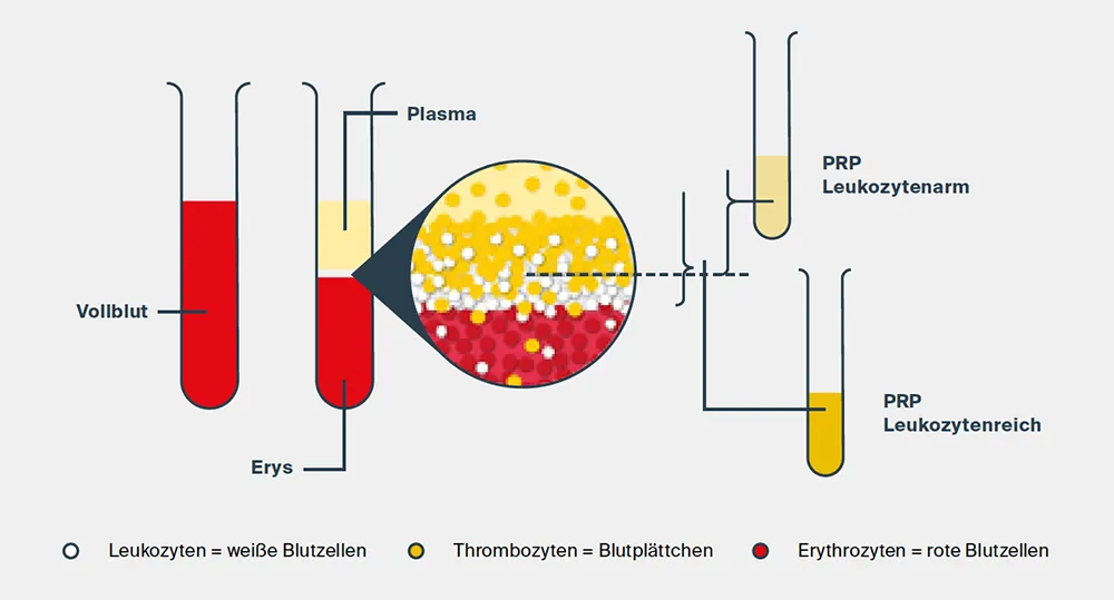 Thrombozyten sind zuständig für die Hämostase und bilden zudem die Grundlage für die erste Phase der Wundheilung. In dieser Phase aggregieren die Blutplättchen und formen den Gerinnungsthrombus. Zudem werden durch Degranulation von Thrombozyten Wachstumsfaktoren (z. B. TGFß, IGF, PDGF) freigesetzt. Kurz zusammengefasst kann die Therapie mit PRP lokale Wachstumsfaktoren freisetzen, die für die Heilung notwendigen Zellen anziehen und diese Zellen zu erhöhter Aktivität stimulieren. Bei der Herstellung von PRP werden die Bestandteile des zuvor abgenommenen und antikoagulierten Vollbluts mittels Zentrifugation aufgetrennt (Abb. 1).