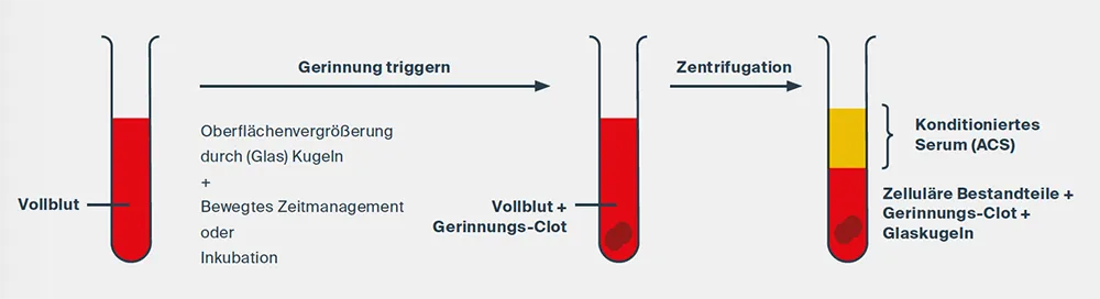 Für die Behandlung der Gonarthrose sollte möglichst leukozytenarmes PRP verwendet werden [9]. Je nach Herstellungsprotokoll besteht die Möglichkeit, aus dem Blut der Patienten unterschiedliche Präparate in Abhängigkeit der zu behandelnden Pathologie herzustellen. Autologes Konditioniertes Serum (ACS) ist beispielsweise eine PRP-Form, bei welcher in einem ersten Schritt die im Vollblut vorhandenen Leukozyten stimuliert werden, wodurch vermehrt entzündungshemmende, regenerierende Zytokine produziert werden. Durch die anschließende Zentrifugation wird ein Serum frei von zellulären Bestandteilen automatisch isoliert und separiert (Abb. 2). ACS eignet sich vor allem zur Behandlung einer entzündlichen aktivierten Arthrose. Entsprechend der Leitlinie kann PRP in Betracht gezogen werden, wenn andere analgetische und funktionsverbessernde Maßnahmen nicht geeignet, kontraindiziert oder nicht wirksam sind [1].