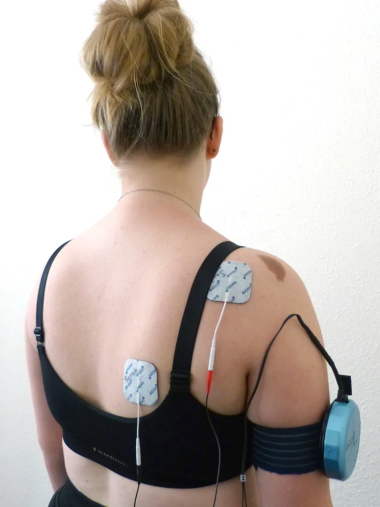 Der Shoulder Pacemaker® ist ein neuromuskuläres Elektrostimulationsgerät (NMES), das durch gezielte elektrische Impulse bestimmte Muskeln der Schulter aktiviert, insbesondere den M. infraspinatus, M. teres minor, die posterioren Anteile des M. deltoideus und den M. trapezius. Diese Muskeln sind essenziell für die dynamische Stabilisierung der Schulter in offenen und geschlossenen kinetischen Ketten. Ziel ist es, durch die Stimulation die zentrale Steuerung und das neuromuskuläre Zusammenspiel zu verbessern. Die Anwendung erfolgt in der Regel während spezifischer Übungen, um die neuromuskuläre Koordination zu trainieren und pathologische Bewegungsmuster zu korrigieren.